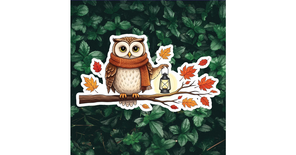 Autumn Owl Vinyl Sticker: Cozy Scarf, Lantern, Waterproof Laptop Decal