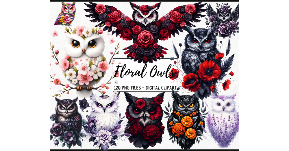 Watercolor Gothic Floral Owls Clipart - dark fantasy watercolor woodland PNG format instant download