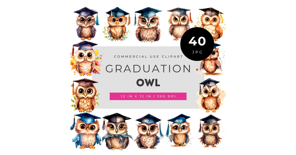 Graduation Owl Clipart Set, Cute Watercolor Graduate Owls with Caps, School Celebration Art for Invi