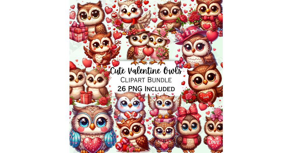 Cute Valentine's Day Owl Clipart Bundle, Whimsical Bird Characters, Adorable Heart-shaped Kawaii