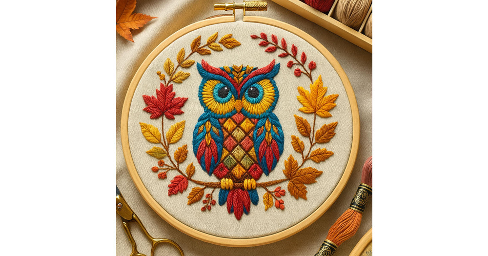 Autumn Owl Embroidery Pattern: Floral Leaves Hoop Art (PDF Download)