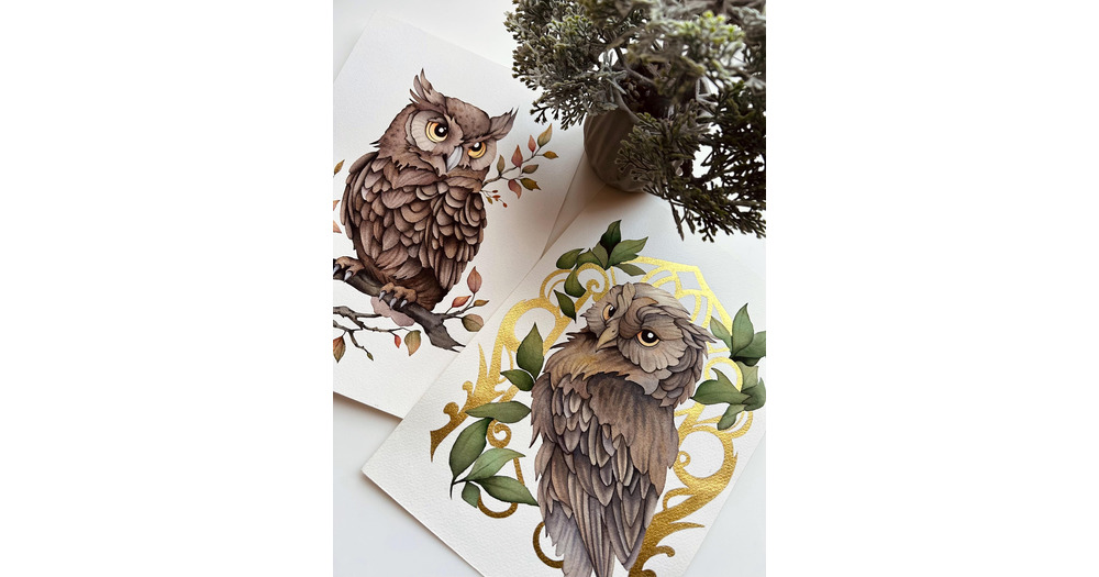 Original Owl Diptych Watercolor Painting, Symbolic Nature-Inspired Art