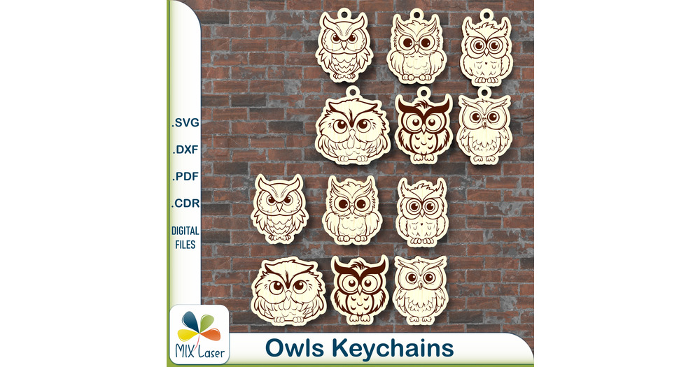 Owls keychains laser cut templates. Glowforge SVG vector files.