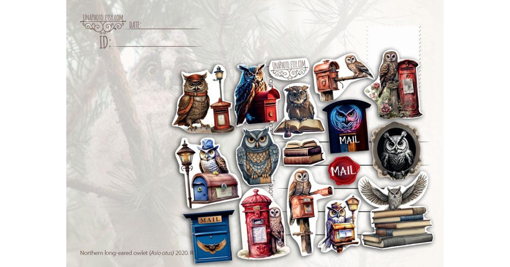 Set of 16 Owl Postman and Mailbox Priorities postcard stickers sheet for Postcrossing fans