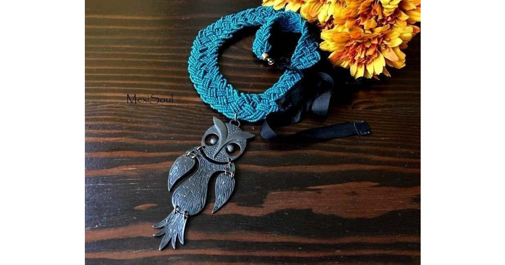 Large Owl Statement Pendant Necklace: Recycled Turquoise & Metal, Bohemian Jewelry