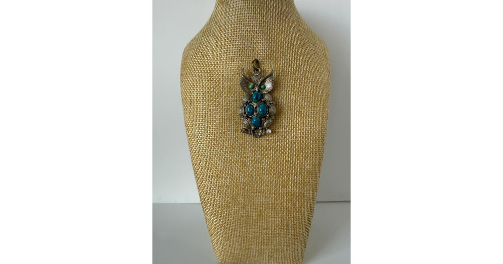 Vintage Silver Tone Owl Pendant with Faux Turquoise Stones