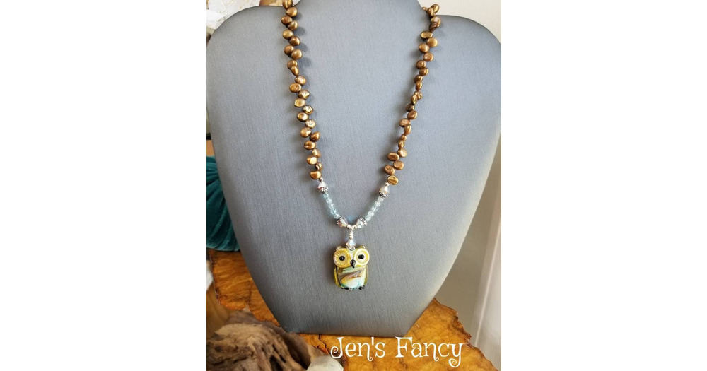Owl Necklace Art Glass with Apatite & Petal Pearls Sterling Silver, Owl Gift for Her, Unique Han