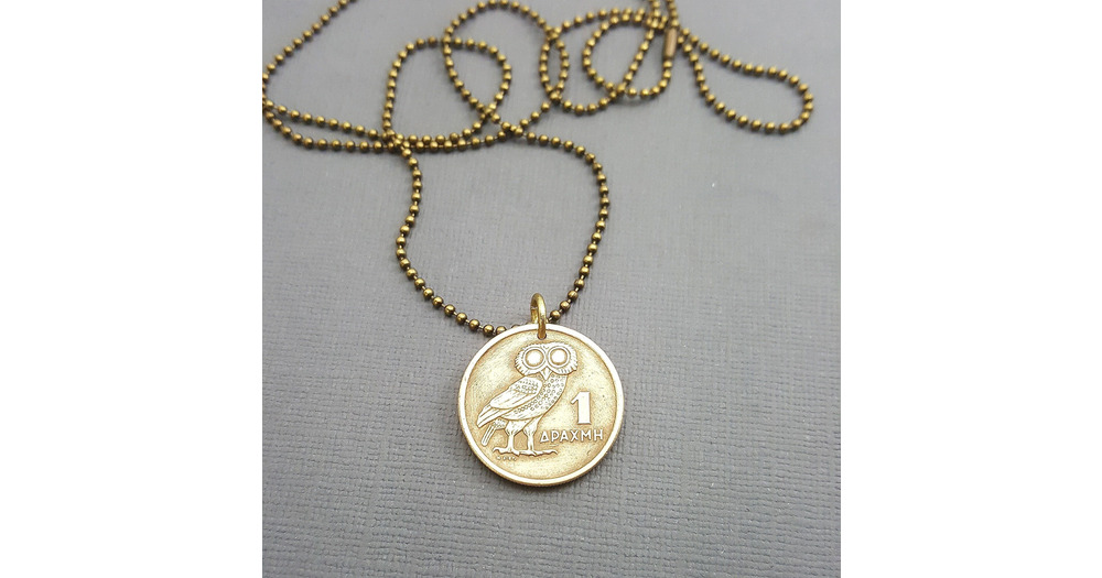 Athena Owl Coin Necklace: 1973 Greek Drachma, Phoenix Rising