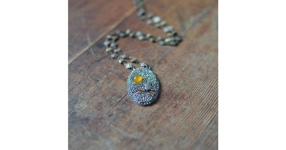 Embroidered Owl Necklace: Starry Night Beaded Pendant, Antique Gold Chain