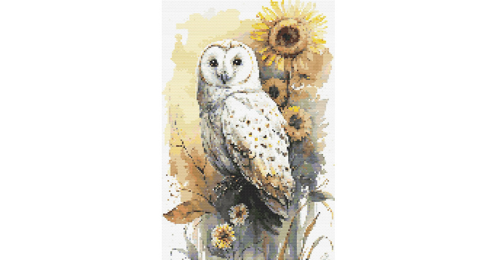 Cross stitch chart – a polar owl with sunflowers in watercolor style, PDF file design, instant