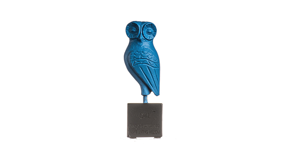 Premium Serie Owl Of Athena Wisdom Sculpture on  Base Blue Color Handmade Alabaster Figurine Greek S