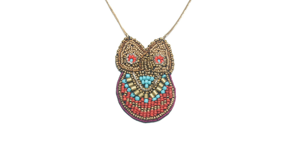 Vintage Artisan Made Beaded Owl Felt Backed Pendant on 30 Inch Gold Tone Chain with Lobster Claw Cla