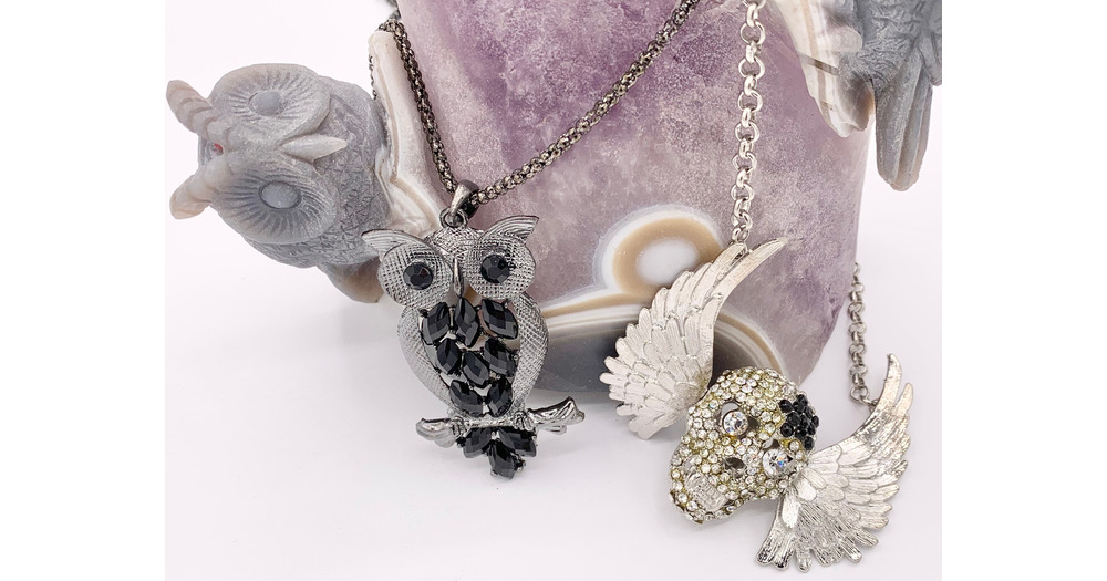 Halloween Necklaces Pewter Crystal 24" Gunmetal Owl & 27" Silver Skull Necklaces