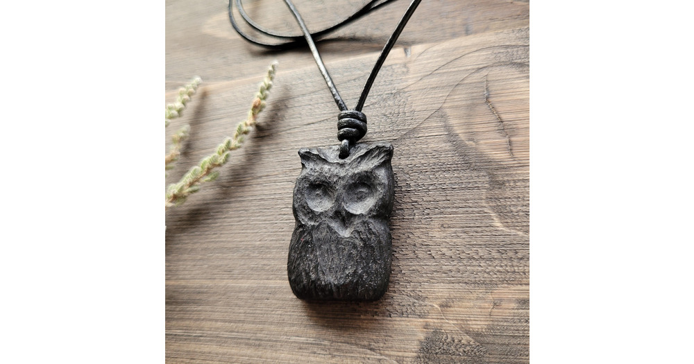 Wooden Owl Pendant Necklace, Hand-carved Irish Bog Oak Wood, Leather Cord