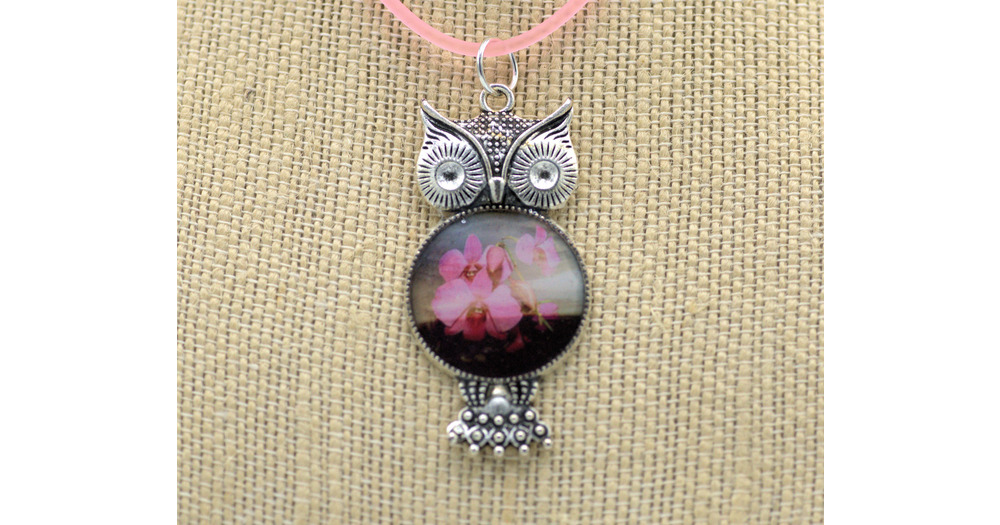Owl Resin Pendant, Orchids, Antique Silver, PInk, Necklace, For her