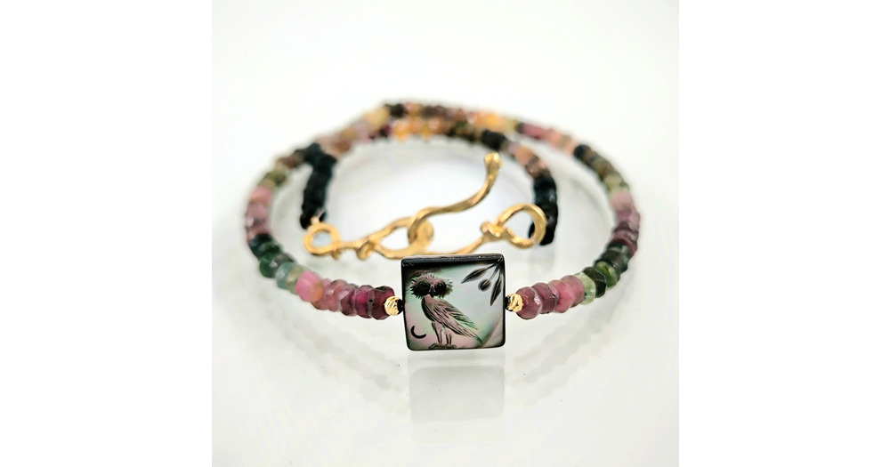 Athena Owl Necklace Intaglio Mother Pearl Tourmaline