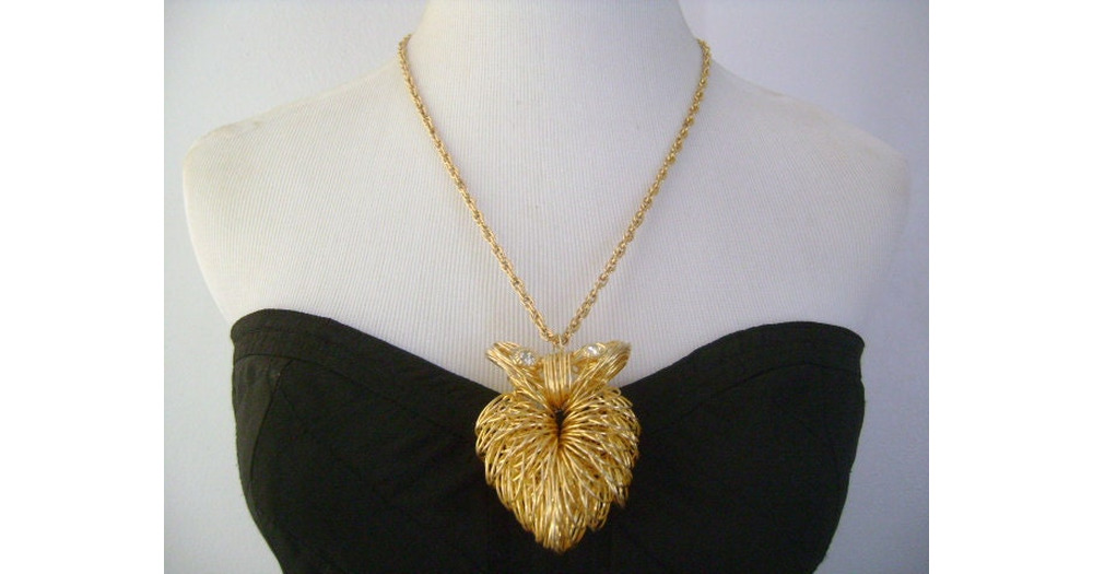 Unusual Wired Wire Sculpture Owl Exotic Bird Pendant Sparkle Rhinestone on The Eyes & Gold Chain