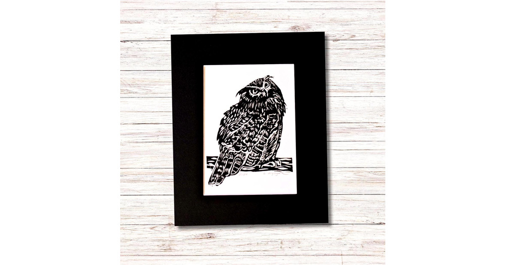Owl Linocut Print: Hand-Carved Art with Black Mat (8x10)