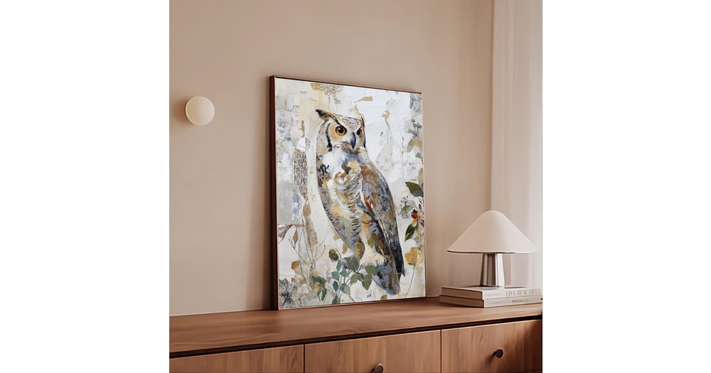Great Horned Owl Mixed Media Fine Art Print, Abstract Bird Wall Art for Living Room, Rustic Nature D
