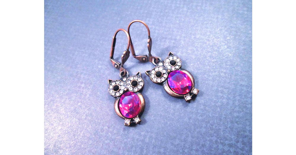 OWL Earrings, Red and White Glass Rhinestone Birds, Copper Dangle Earrings, FREE Shipping