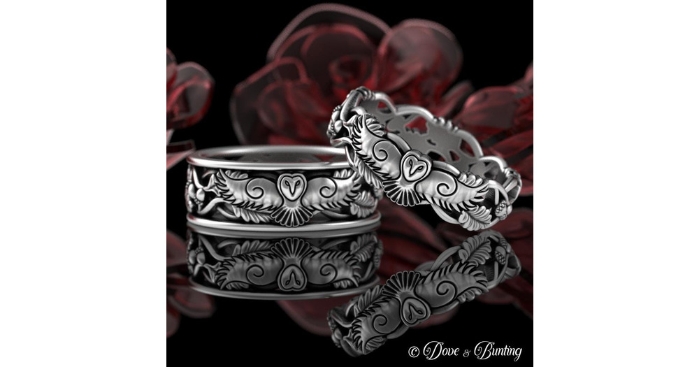 Sterling His Hers Matching Owl Wedding Bands, Silver Couples Great Horned Owl Forest Wedding Ring Se