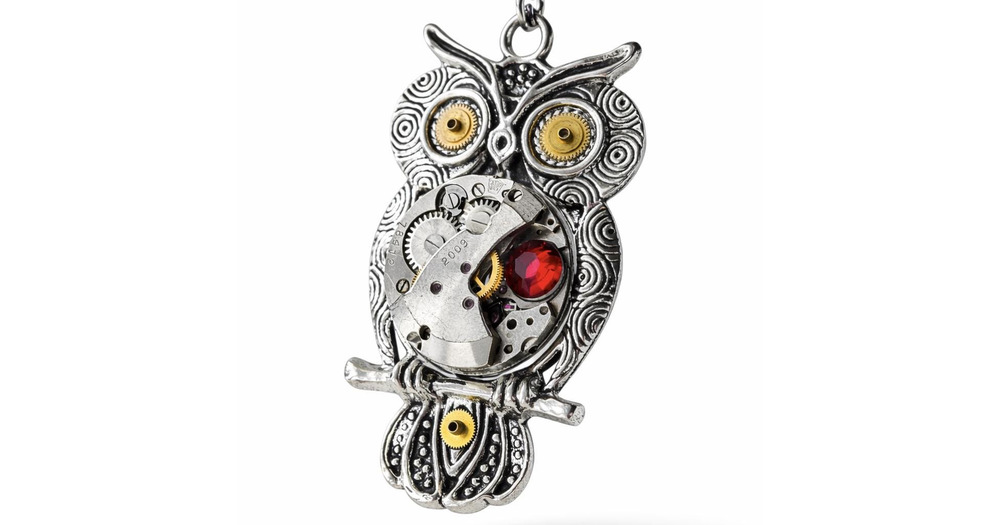 Steampunk Owl Pendant Necklace – Watch Movement Jewelry with Red Crystal – Silver Mechan
