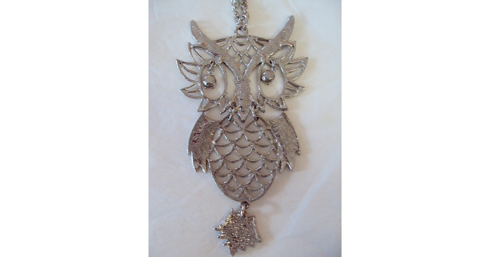 Large Owl Vintage Necklace Silver Tone Rhinestone Eyes NOS