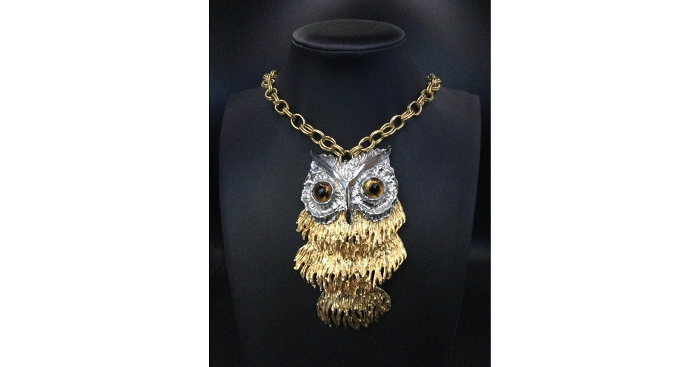 Vintage Large Gold Tone Chain Owl Pendant Necklace, 1960's 1970's Jewelry
