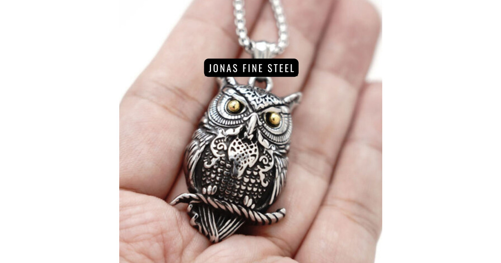 Vintage Lucky Owl Bird Stainless Steel Pendant Necklace | Intricate Wisdom Filled Owl With Yellow Ey