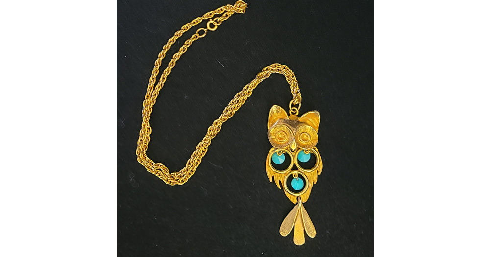 Vintage MOD Articulated Owl with Turquoise Color Hanging Charm Beads Pendant Gold Tone Necklace