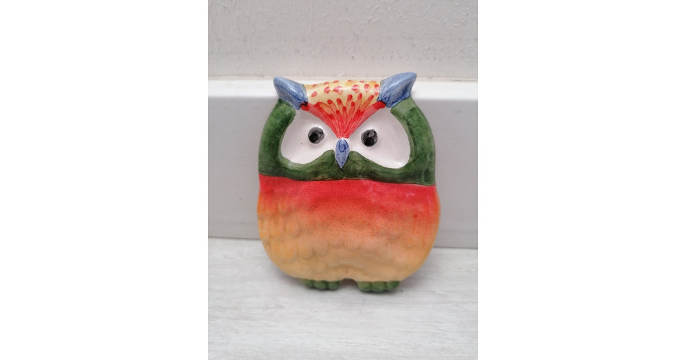 Vintage Glazed Ceramic Owl Ornament: Colorful Hand-Painted Pottery