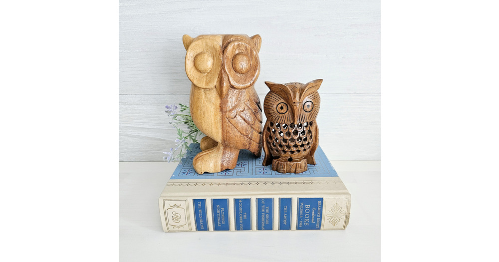 Set Of Two Carved Wooden Owls