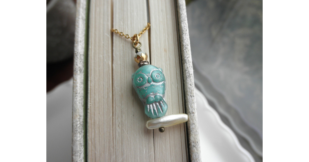 Blue Czech Glass Owl Necklace - Pearl Branch Charm, Boho Jewelry