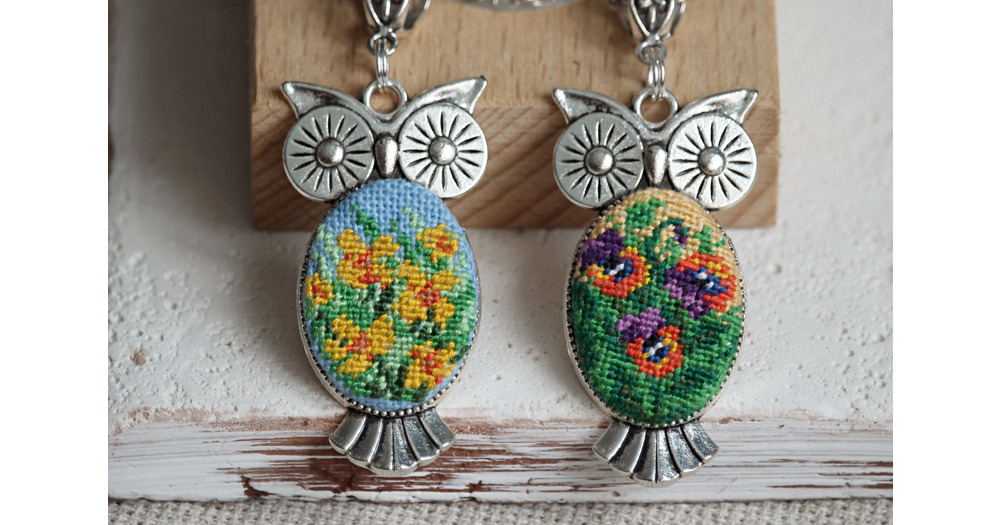 Embroidered Owl Necklace: Pansies or Daffodil Pendant, Floral Jewelry