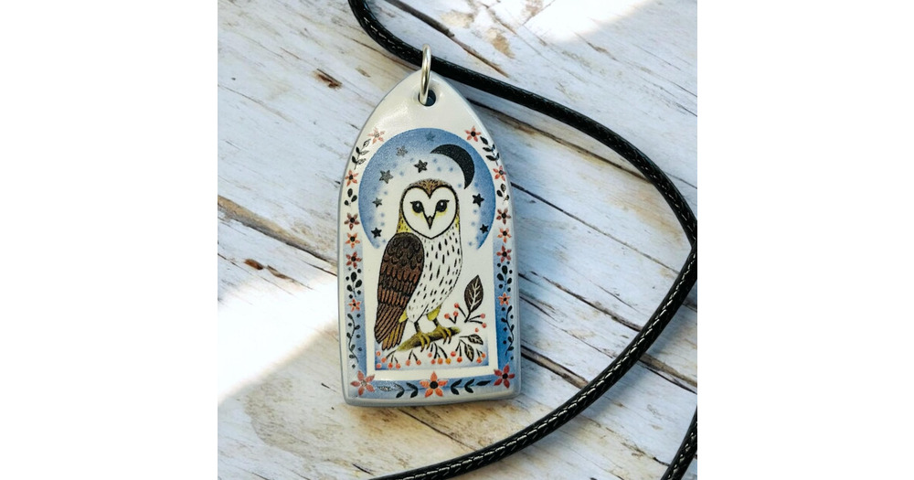 Handmade Ceramic Owl Pendant: Starlit Sentinel, Blue Clay Necklace