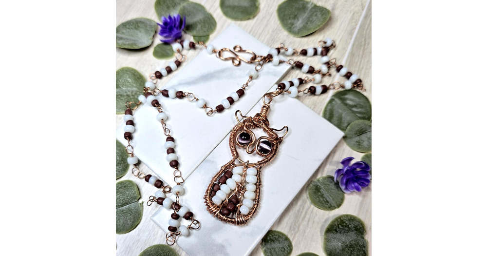 Wire Wrapped Owl Pendant – Copper Rosary Chain & Cat Eye Beads