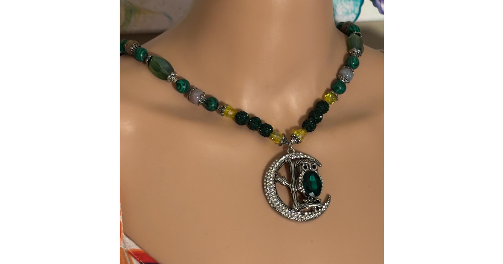 Beaded Necklace, Blinged Owl Pendant Necklace Sitting In The Moonlight