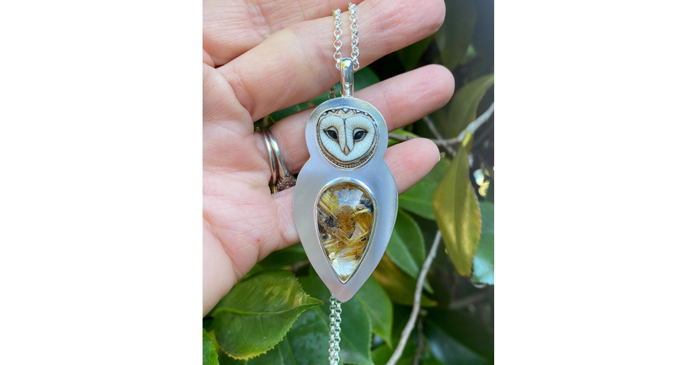 Star Rutile Barn Owl Pendant with Rare Laura Mears Porcelain Owl Face