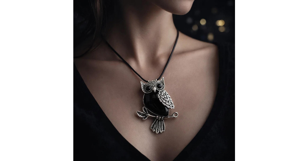 Black Onyx Owl Pendant Necklace, Vintage Silver Gothic Boho Jewelry