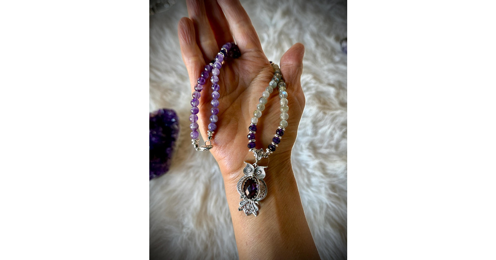 Amethyst Owl Necklace, Labradorite Gemstone, Sterling Silver