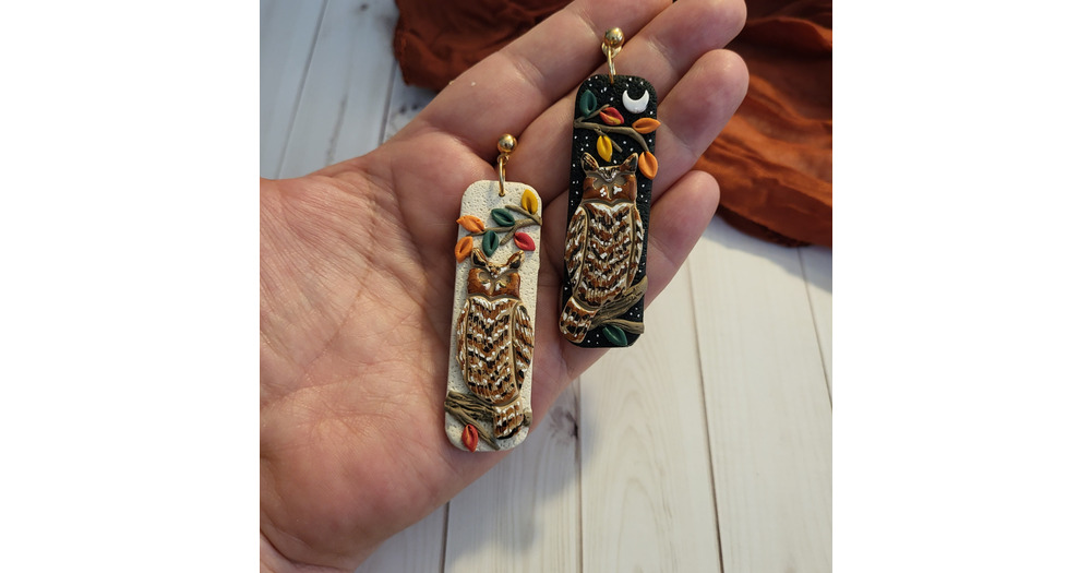 Mismatched Horned Owl Earrings, Hand-Sculpted Polymer Clay, Autumn Dangles