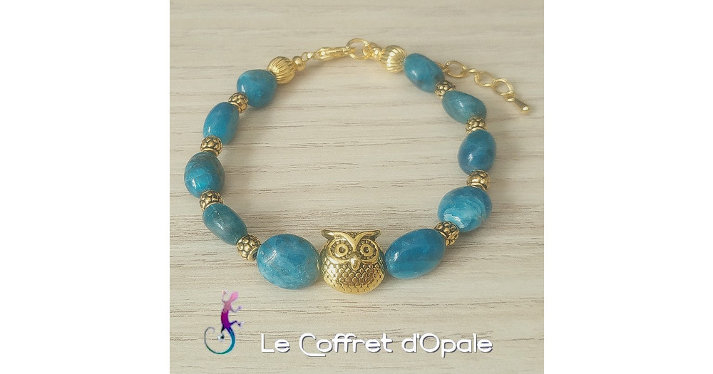 Bracelet Hibou doré et nuggets en apatite turquoise, perles intercalaires en métal dor