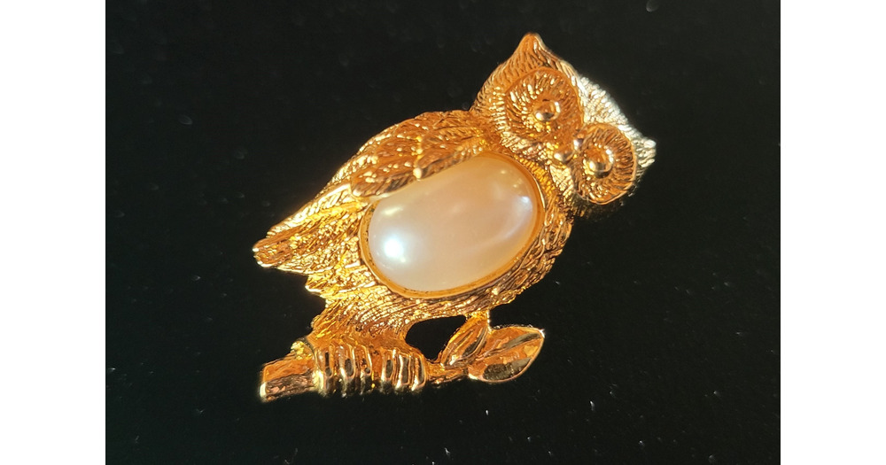 Vintage AVON Owl Pin: Gold Tone Faux Mother of Pearl Lapel Pin, 1995