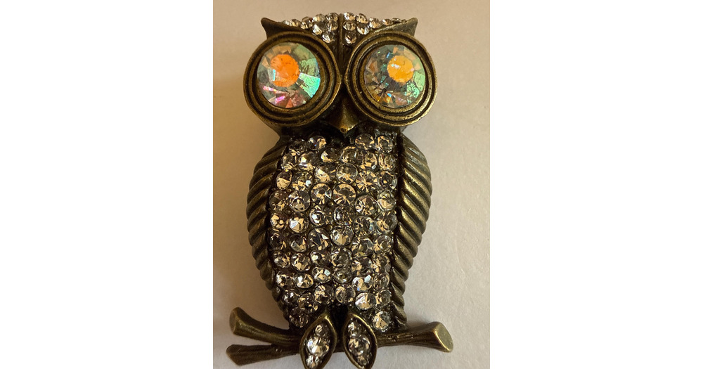 Vintage Owl Brooch Rhinestone Aurora Borealis Eyes Antiqued Brass Tone Figural Pin Statement Jewelry