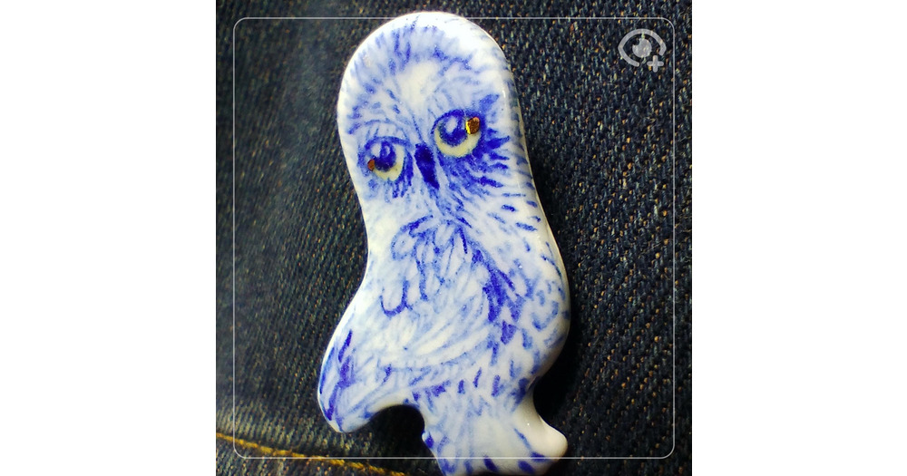 Delft Owl, White Blue, Porcelain Brooch, 22k Gold Details, Handmade