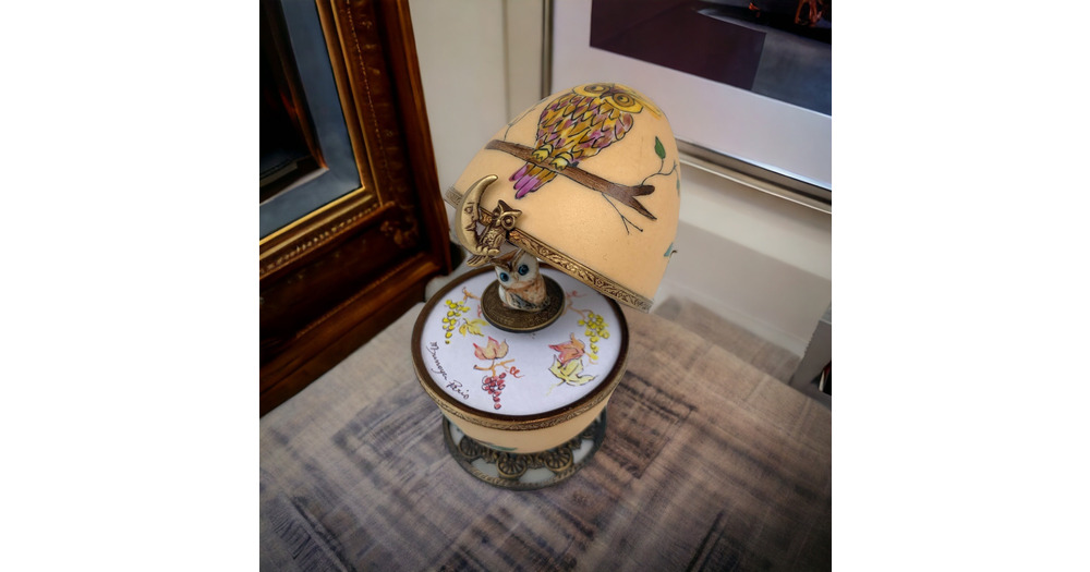 Chouette, boite à musique oeuf, porcelaine de Limoges décorée à la main.