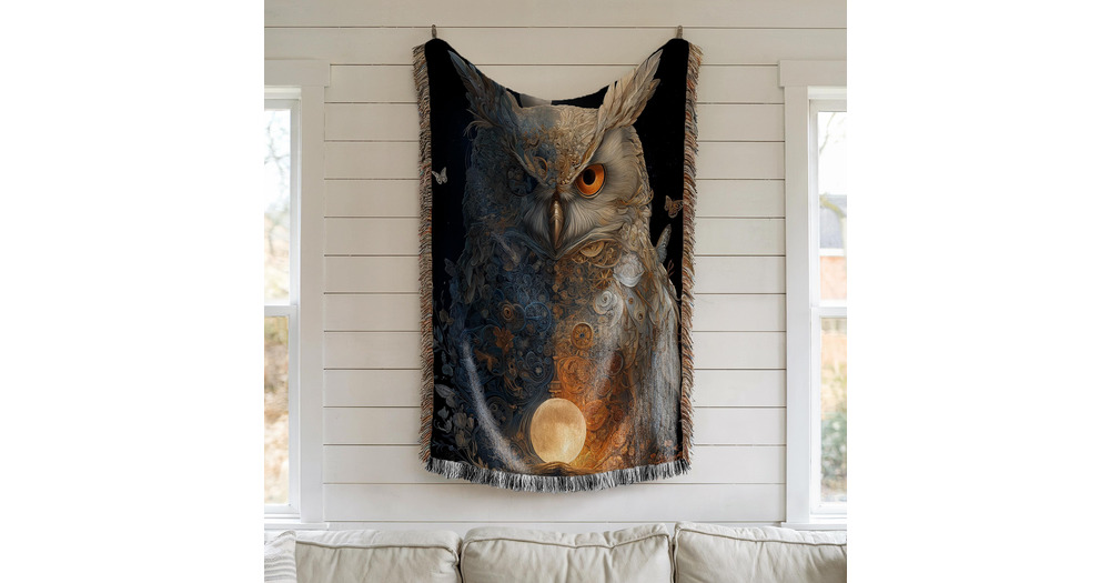 Owl Moon Blanket: Woven Cotton, Navy and Copper Night Art