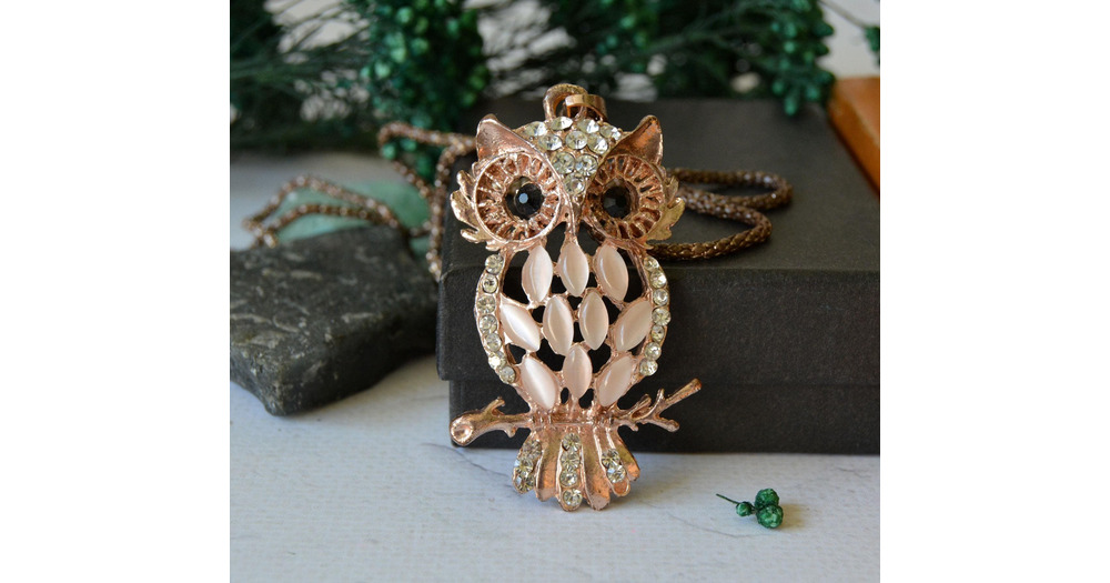Vintage Jeweled Owl Pendant Necklace: Gold Tone Rhinestone Woodland Jewelry