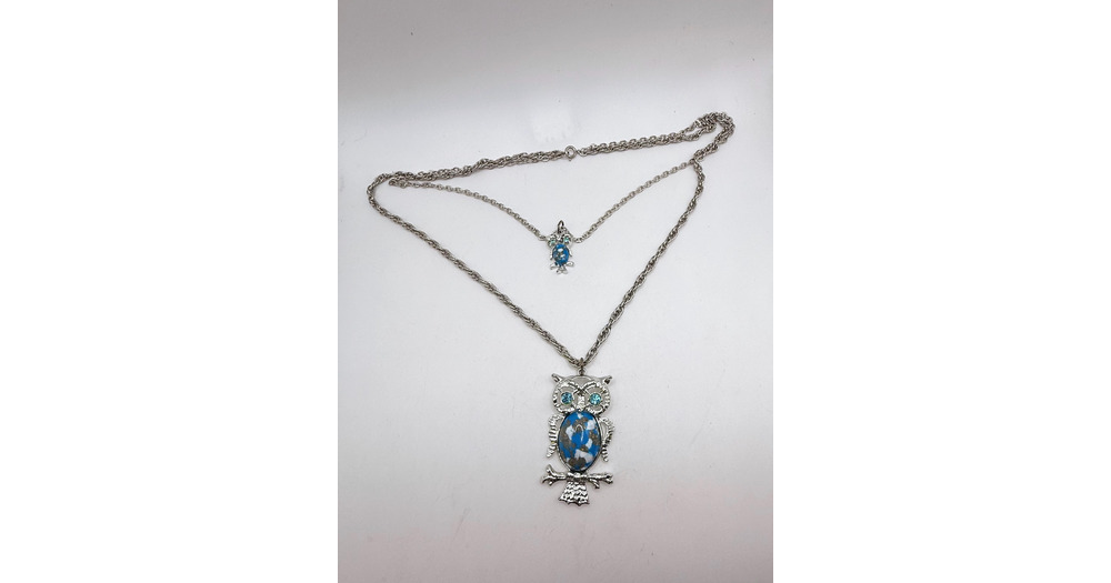 Vintage two layer rhinestone cabochon silver tone owl pendant necklace