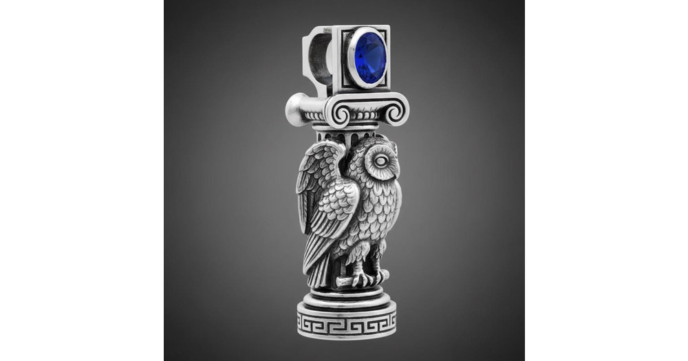 Sterling Silver Athena Owl Pendant, Sapphire Blue Stone Greek Column Necklace, Ionic Greek Key Amule